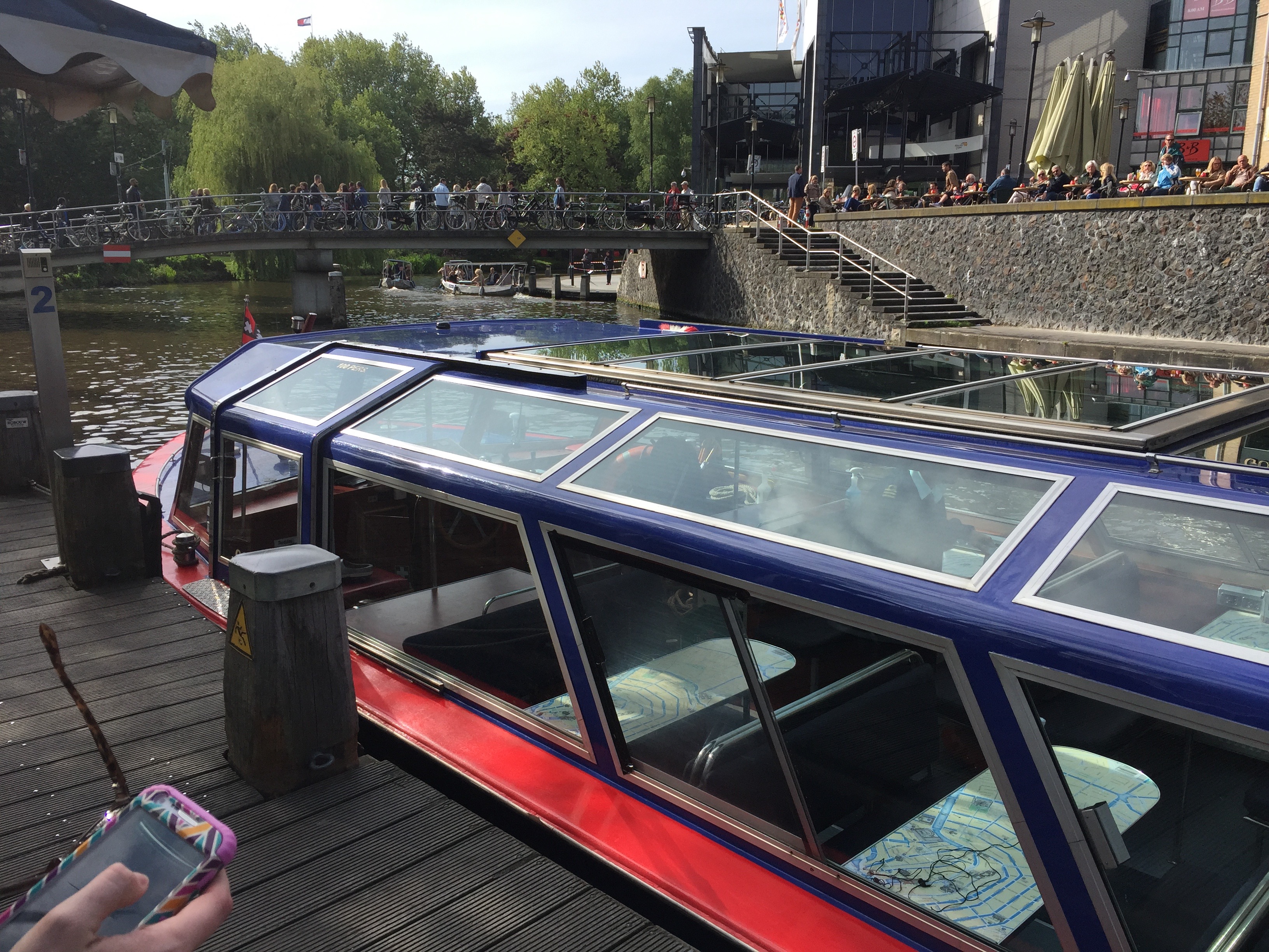 Yesterday was a day of firsts. My second day in Holland took us into the city of Utrecht, a beautiful city. Much of the architecture is similar to Amsterdam and other parts of Holland, but it is much more laid back and less touristy. I wanted to tour the canals, and so we did, quite literally. There are these electric boats right, that you can have remotely activated. They hold about 8 people, and you simply unplug it and go…so of course I drove because – why not.